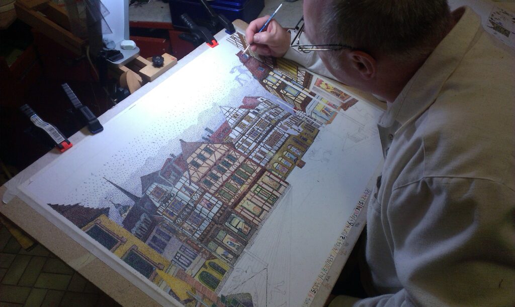 Es gibt sehr viele Bilder, die nur aus Punkten bestehen. Die früheren Pointillisten nutzten dazu den vollen Pinsel. Ihre Punkte waren demnach sehr viel größer, als meine. Meine Bilder bestehen aus Stecknadelkopf, große Pünktchen – oder Pixel, wie man will und möchte. Dabei füllen 1 cm² ca 250 Pünktchen. Das gibt es weltweit, soweit ich weiß, nicht nochmal.